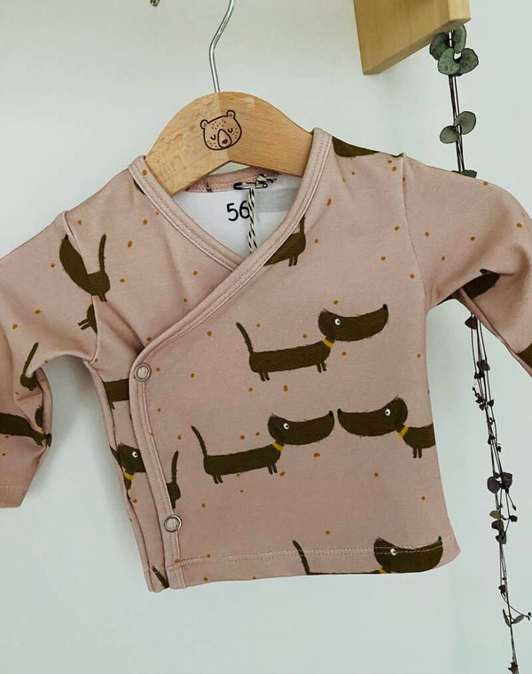 Dit overslagshirtje kan je in diverse stoffen bestellen. Een fijn overslag model om makkelijk aan te doen. Met drukknopen aan de binnenkant en voorkant van het shirtje.